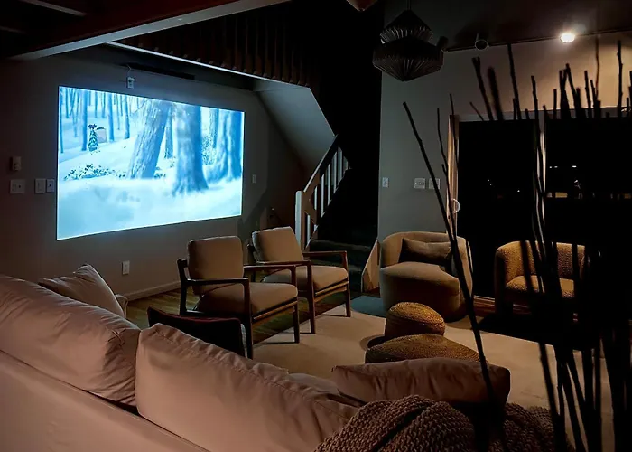 The accommodations at the Poconos Modern Chalet create an inviting atmosphere, featuring spacious living areas adorned with stylish furnishings and exquisite decor. With multiple private bedrooms, each equipped with plush bedding, guests will find the perfect sanctuary for rest and rejuvenation. Enjoy movie nights in the state-of-the-art home theater, or unwind in the hot tub under a starlit sky, making unforgettable memories with loved ones.